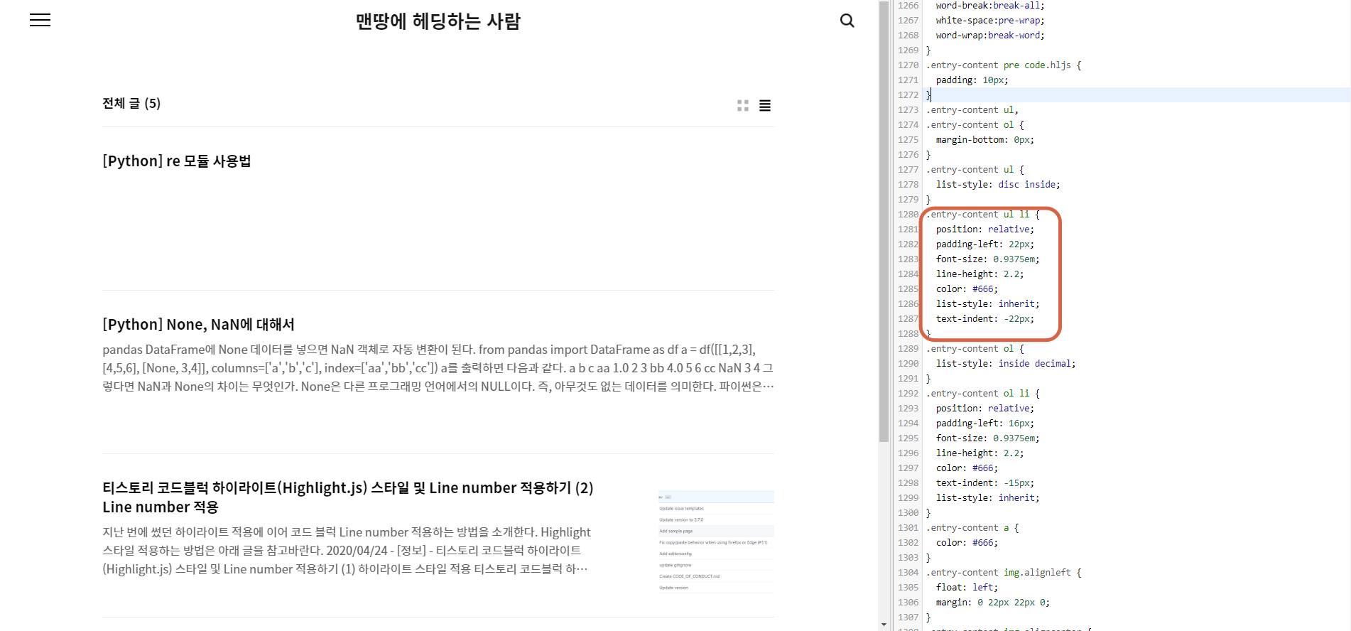 나의 경우 line-height 가 리스트 서식의 줄 간격을 의미하므로, 이 값을 2.2로 수정하였다. 이건 실제 적용되는 게 아니고 내가 보고 있는 이 화면에서만 적용되는 것이므로 마음껏 값을 바꿔가며 어떤 값이 가장 보기 좋은지 확인해야 한다.